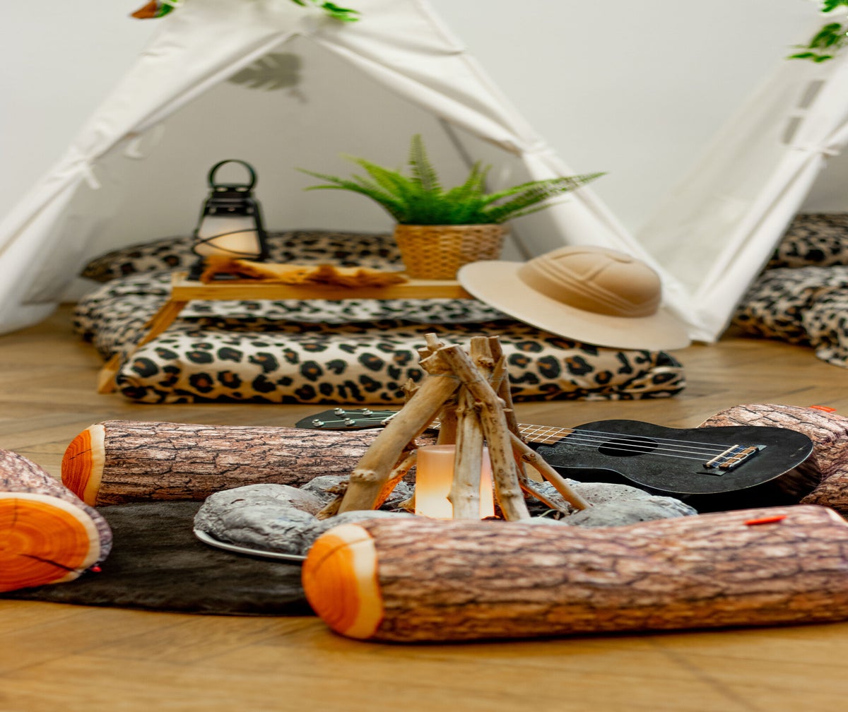 - Matje met kampvuur en boomstamkussens